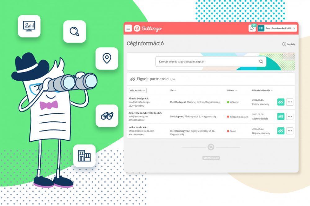 A Billingo Céginfó szolgáltatásával egy igazi kincsesbánya került a billingós fiókokba. Az új szolgáltatás a vállalkozások egyik legfontosabb adatbázisa lett, ahol a lehető legpontosabb, legfrissebb adatok gyűjthetők a partnerekről, a konkurenciáról vagy bármely másik hazai egyéni vállalkozóról, vállalkozásról vagy civil szervezetről.